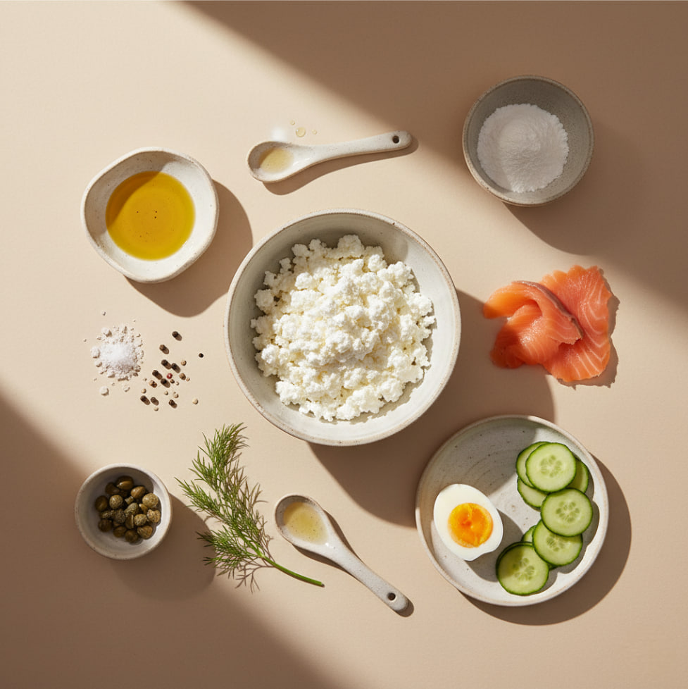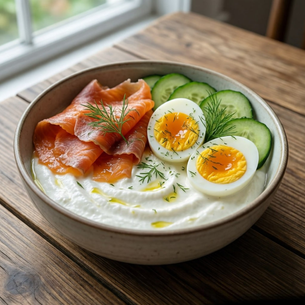 - Assemble the bowl: Spread the cottage cheese mixture into a serving bowl as the base. Arrange the smoked salmon on top, followed by the halved egg. Add sliced cucumber and sprinkle fresh dill over everything.
