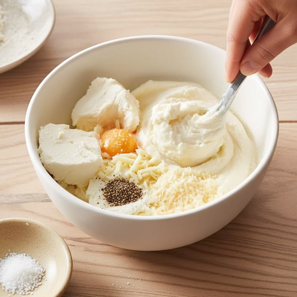 - Mix the cheese layer: In a bowl, combine ricotta, the egg, half of the mozzarella, nutmeg, salt, and black pepper. Mix until smooth and creamy.