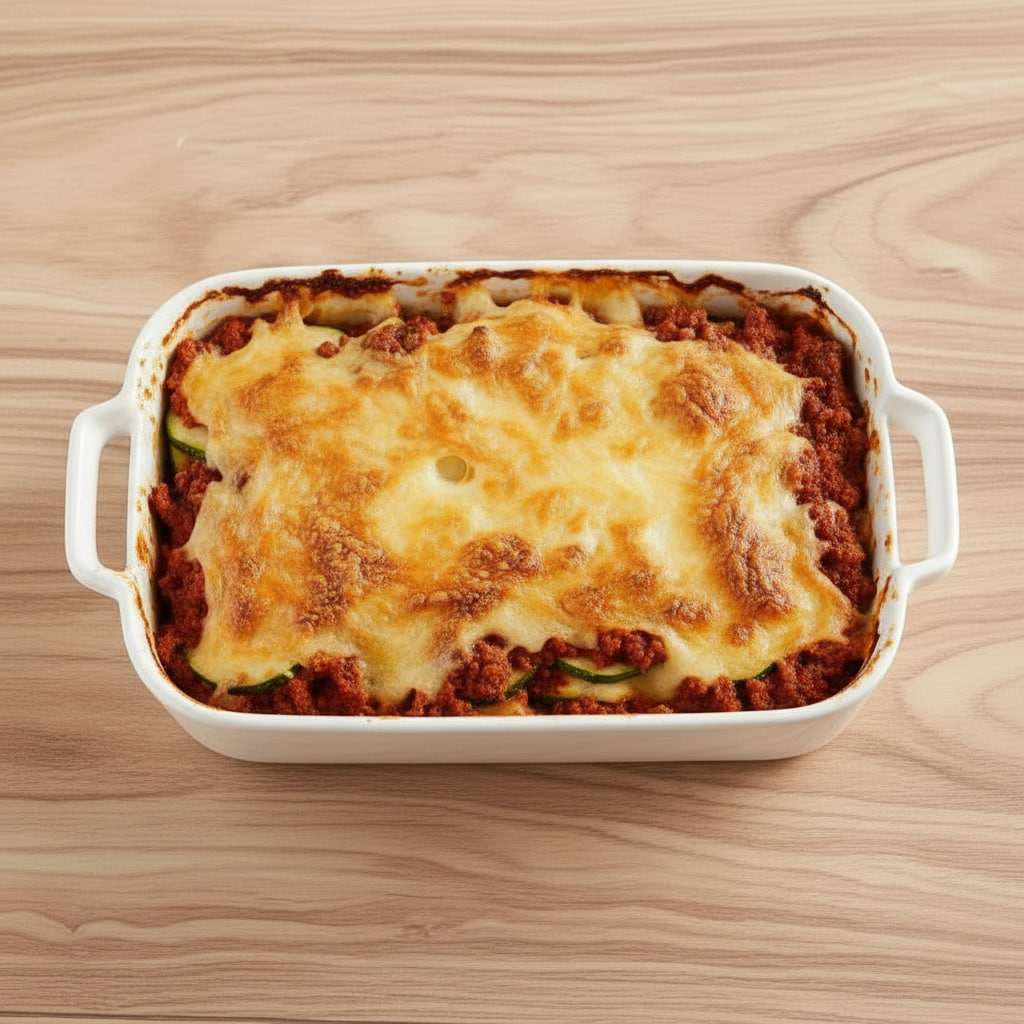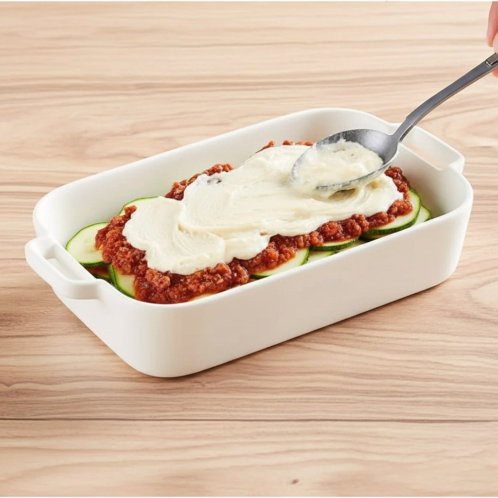 - Assemble the lasagna: In a baking dish, layer zucchini or eggplant slices, followed by meat sauce and cheese mixture. Repeat the layers, finishing with the remaining mozzarella and Parmesan on top.