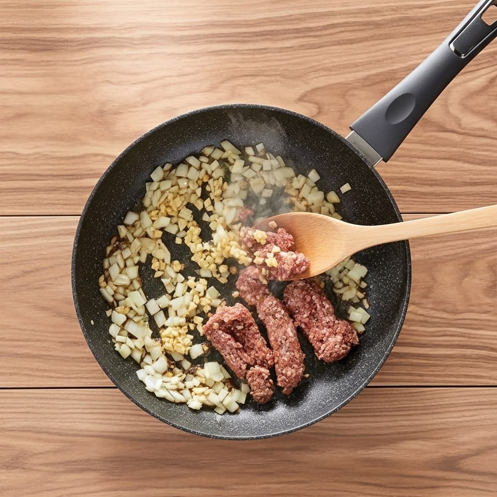 - Make the meat sauce: Heat olive oil in a skillet over medium heat. Add the chopped onion and garlic and sauté until soft and fragrant. Add the ground meat and cook, breaking it up, until fully browned. Stir in the tomato sauce and herbs, then reduce heat and simmer for about 10 minutes so the flavors can develop and the sauce thickens slightly.